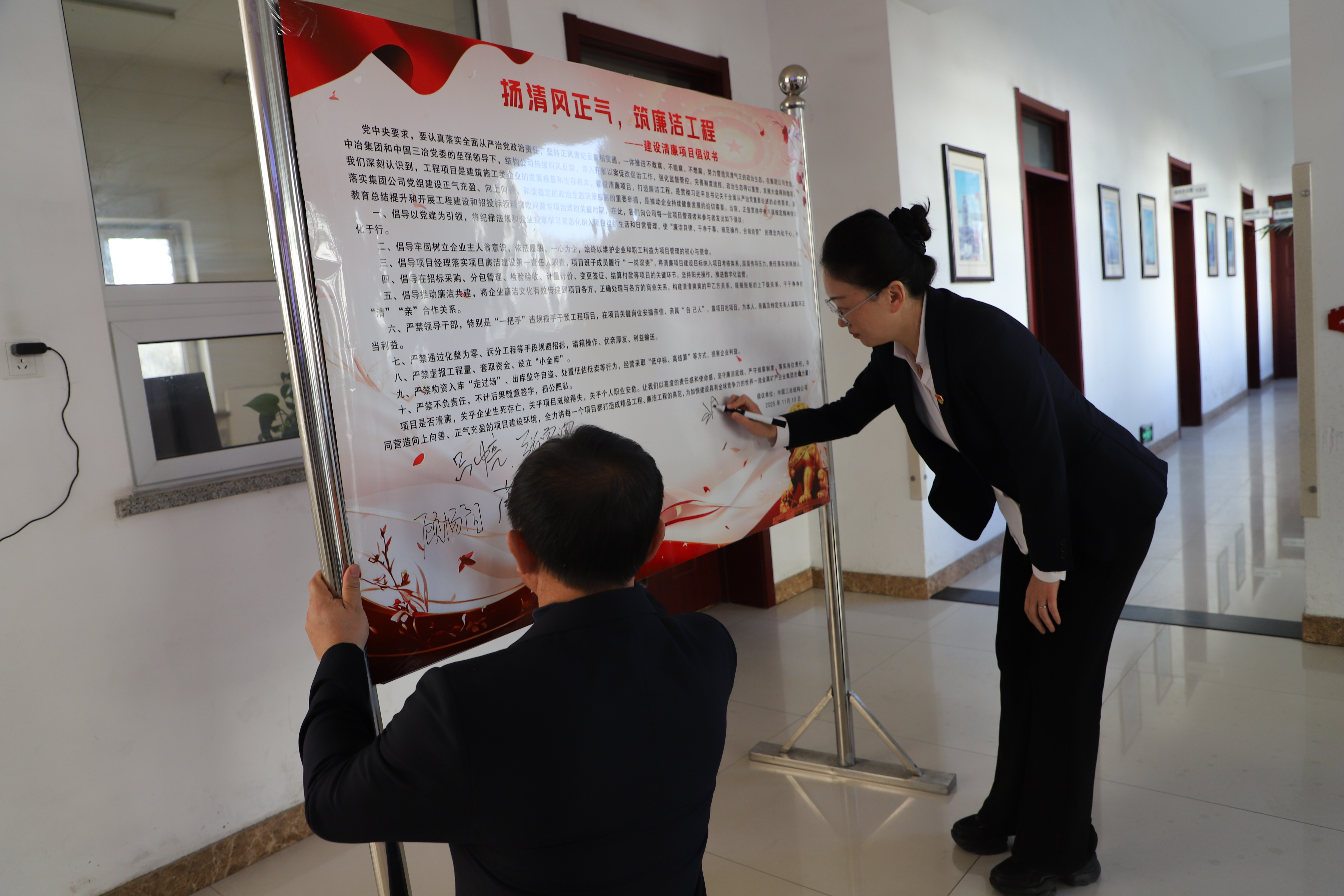 公司各基層黨支部依托“三會一課”等有效形式,積極主動、有力有序地動員黨員干部深入學習《建設清廉項目倡議書》。廣大黨員干部以“筆尖千斤重”般的強烈責任感,在《倡議書》上鄭重簽名并作出承諾,為打造“清廉工程”注入了強大而堅實的動力。